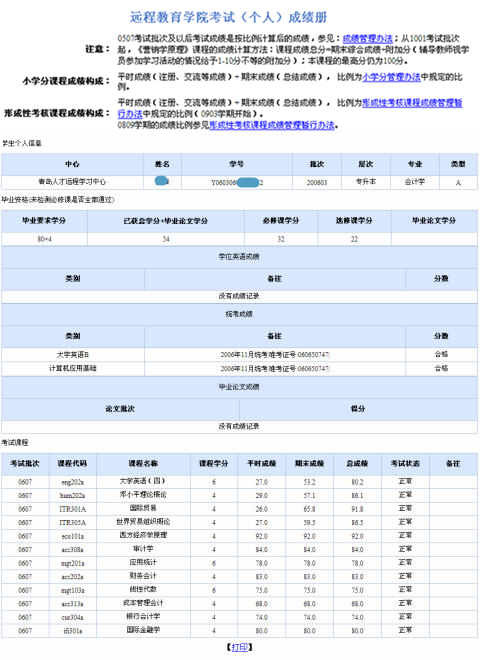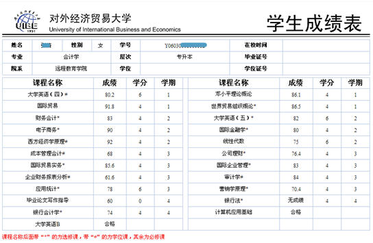 点击左侧树形导航栏中的“学籍管理”下 “我的成绩单”,页面显示学员的我的成绩单信息。成绩单信息显示学员所有在学或已学课程的成绩,若学员在学课程未进行考试,课程成绩显示“无成绩”。在我的成绩单中,课程名称后带“*”的为选修课,带“#”为学位课。如下图: