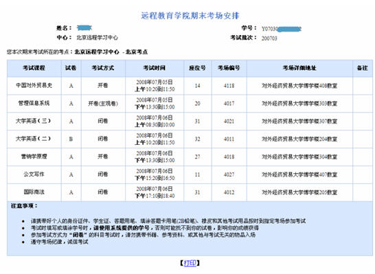在考场查询开放时间内,点击学习平台左侧树形导航栏中的“考场查询”,进入考场查询页面,页面上方显示个人信息,下方显示课程考场分布和注意事项。